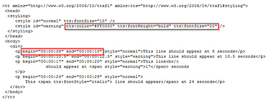 要将标题文本与视频同步,您需要指定标题应在XML文件中显示的时间。可以将以下格式应用于关闭标题文本: