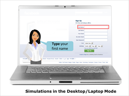首先让我们开始台式机/笔记本电脑电子学习。我们非常熟悉台式机/笔记本学习的诀窍;我们有更大的屏幕尺寸,因此有更多的空间。这门课的全局策略是指导和学习,我们有一个角色引导学习者通过软件的模拟和步骤。然后,学习者可以自己进行模拟。以响应的方式提出这样的要求是一项艰巨的任务;下面是我们在桌面模式下的操作。